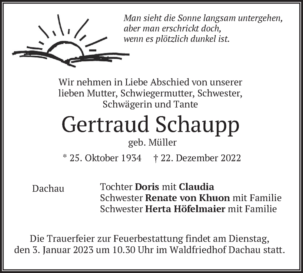 Hier finden Sie alle Traueranzeigen aus der Zeitung, die bisher für Gertraud Schaupp erschienen sind. Weitere Traueranzeigen, die in der Zeitung erscheinen, werden hier ebenfalls aufgelistet
