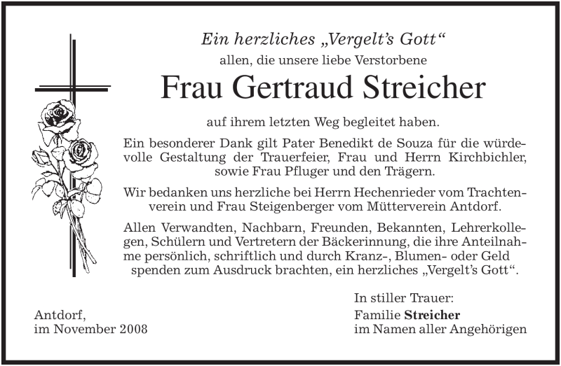Hier finden Sie alle Traueranzeigen aus der Zeitung, die bisher für Gertraud Streicher erschienen sind. Weitere Traueranzeigen, die in der Zeitung erscheinen, werden hier ebenfalls aufgelistet