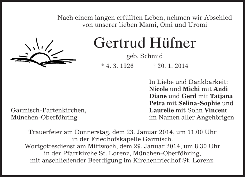 Hier finden Sie alle Traueranzeigen aus der Zeitung, die bisher für Gertrud Hüfner erschienen sind. Weitere Traueranzeigen, die in der Zeitung erscheinen, werden hier ebenfalls aufgelistet