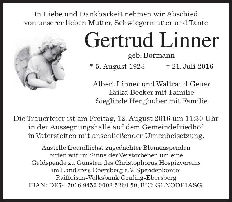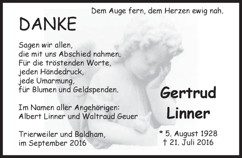 Hier finden Sie alle Traueranzeigen aus der Zeitung, die bisher für Gertrud Linner erschienen sind. Weitere Traueranzeigen, die in der Zeitung erscheinen, werden hier ebenfalls aufgelistet