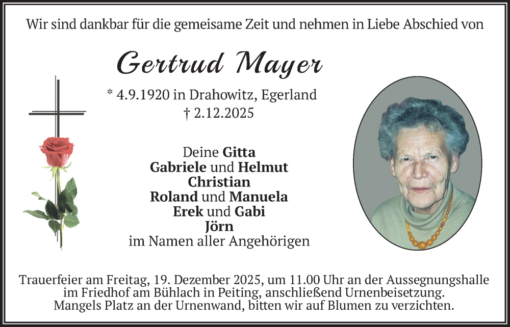 Hier finden Sie alle Traueranzeigen aus der Zeitung, die bisher für Gertrud Mayer erschienen sind. Weitere Traueranzeigen, die in der Zeitung erscheinen, werden hier ebenfalls aufgelistet