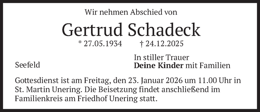 Hier finden Sie alle Traueranzeigen aus der Zeitung, die bisher für Gertrud Schadeck erschienen sind. Weitere Traueranzeigen, die in der Zeitung erscheinen, werden hier ebenfalls aufgelistet