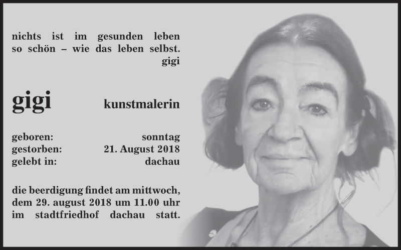 Hier finden Sie alle Traueranzeigen aus der Zeitung, die bisher für gigi erschienen sind. Weitere Traueranzeigen, die in der Zeitung erscheinen, werden hier ebenfalls aufgelistet