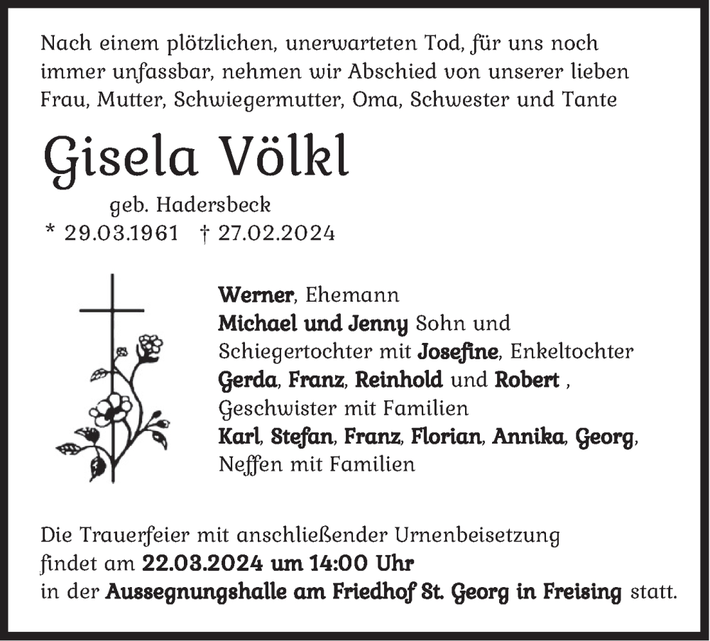 Hier finden Sie alle Traueranzeigen aus der Zeitung, die bisher für Gisela Völkl erschienen sind. Weitere Traueranzeigen, die in der Zeitung erscheinen, werden hier ebenfalls aufgelistet