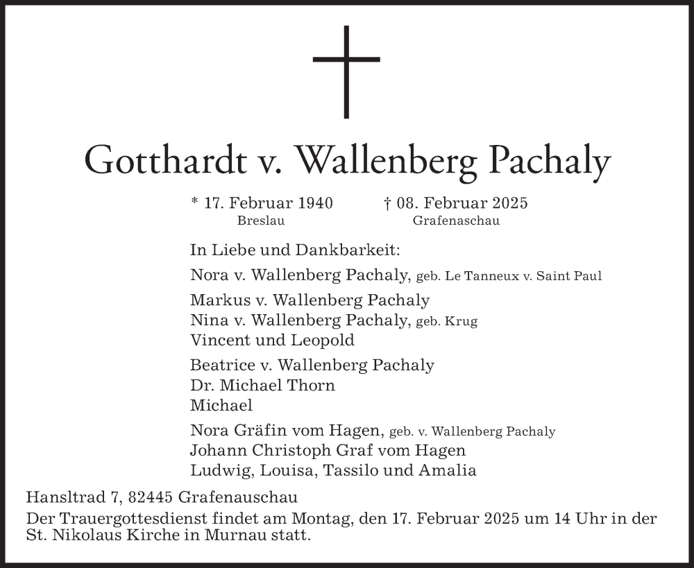 Hier finden Sie alle Traueranzeigen aus der Zeitung, die bisher für Gotthardt v. Wallenberg Pachaly erschienen sind. Weitere Traueranzeigen, die in der Zeitung erscheinen, werden hier ebenfalls aufgelistet