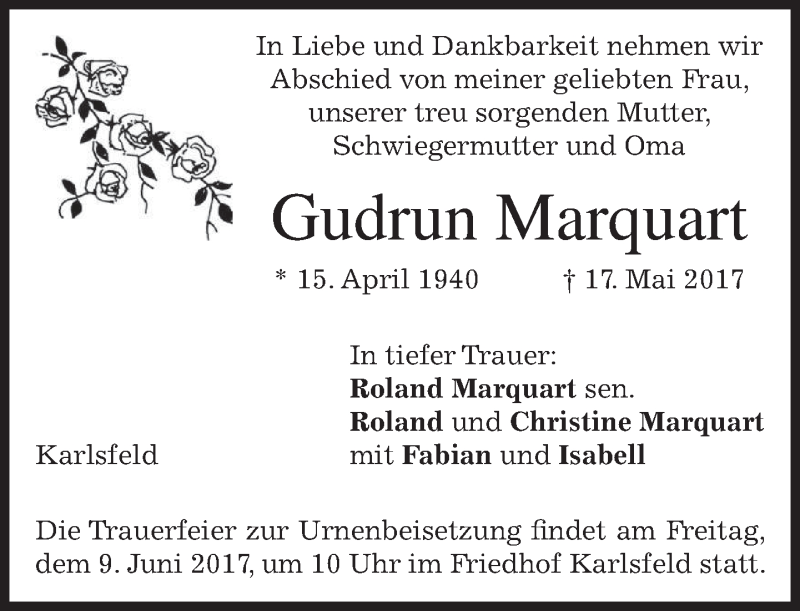 Hier finden Sie alle Traueranzeigen aus der Zeitung, die bisher für Gudrun Marquart erschienen sind. Weitere Traueranzeigen, die in der Zeitung erscheinen, werden hier ebenfalls aufgelistet