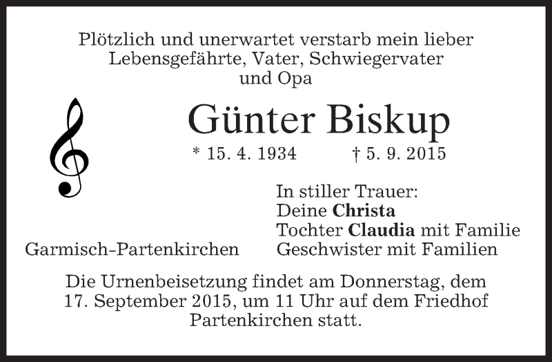 Hier finden Sie alle Traueranzeigen aus der Zeitung, die bisher für Günter Biskup erschienen sind. Weitere Traueranzeigen, die in der Zeitung erscheinen, werden hier ebenfalls aufgelistet