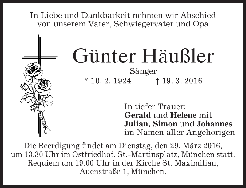 Hier finden Sie alle Traueranzeigen aus der Zeitung, die bisher für Günter Häußler erschienen sind. Weitere Traueranzeigen, die in der Zeitung erscheinen, werden hier ebenfalls aufgelistet