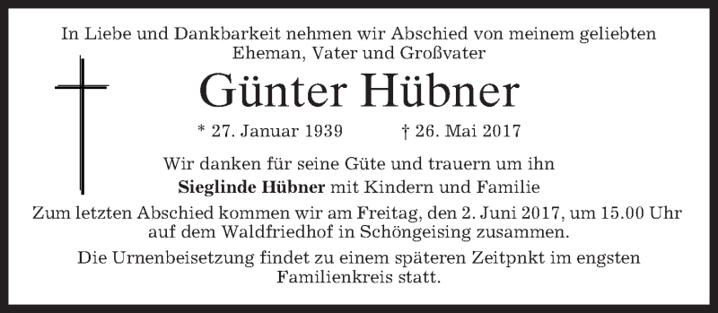 Hier finden Sie alle Traueranzeigen aus der Zeitung, die bisher für Günter Hübner erschienen sind. Weitere Traueranzeigen, die in der Zeitung erscheinen, werden hier ebenfalls aufgelistet