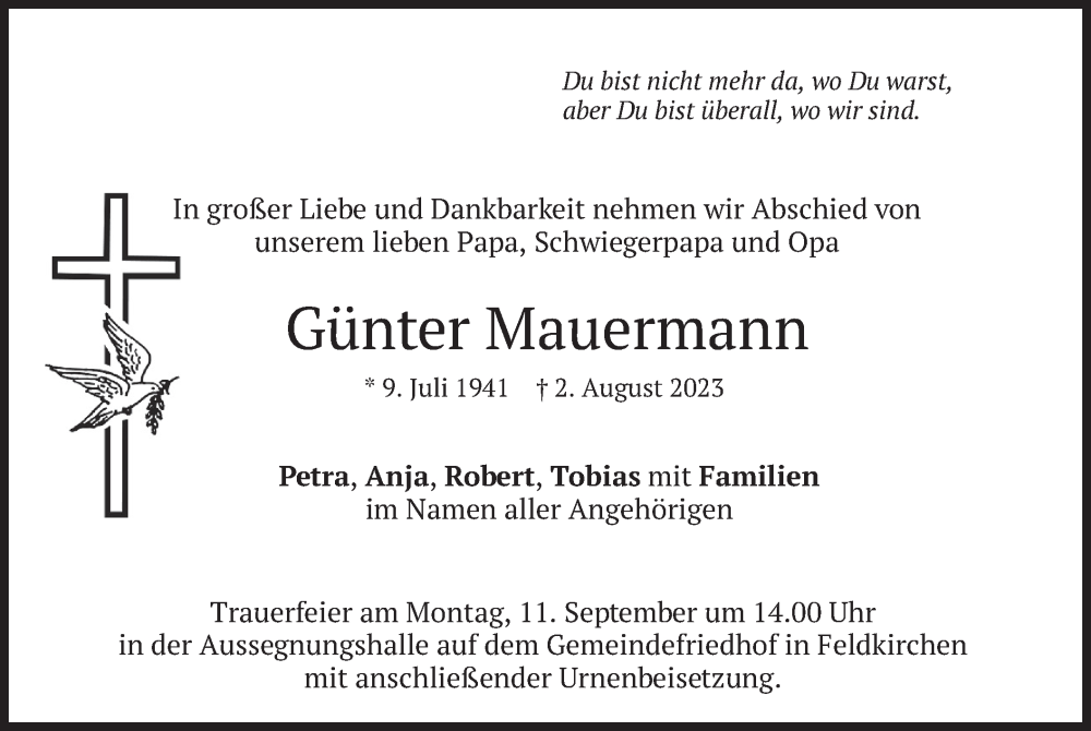 Hier finden Sie alle Traueranzeigen aus der Zeitung, die bisher für Günter Mauermann erschienen sind. Weitere Traueranzeigen, die in der Zeitung erscheinen, werden hier ebenfalls aufgelistet