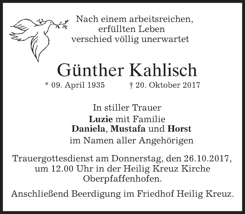Hier finden Sie alle Traueranzeigen aus der Zeitung, die bisher für Günther Kahlisch erschienen sind. Weitere Traueranzeigen, die in der Zeitung erscheinen, werden hier ebenfalls aufgelistet