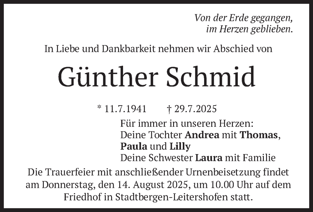 Hier finden Sie alle Traueranzeigen aus der Zeitung, die bisher für Günther Schmid erschienen sind. Weitere Traueranzeigen, die in der Zeitung erscheinen, werden hier ebenfalls aufgelistet