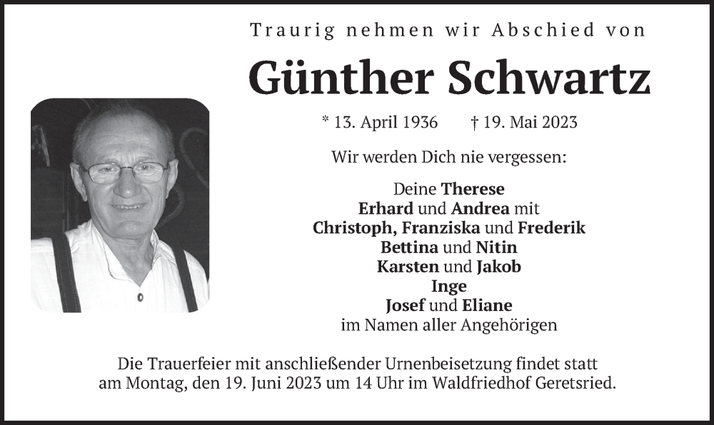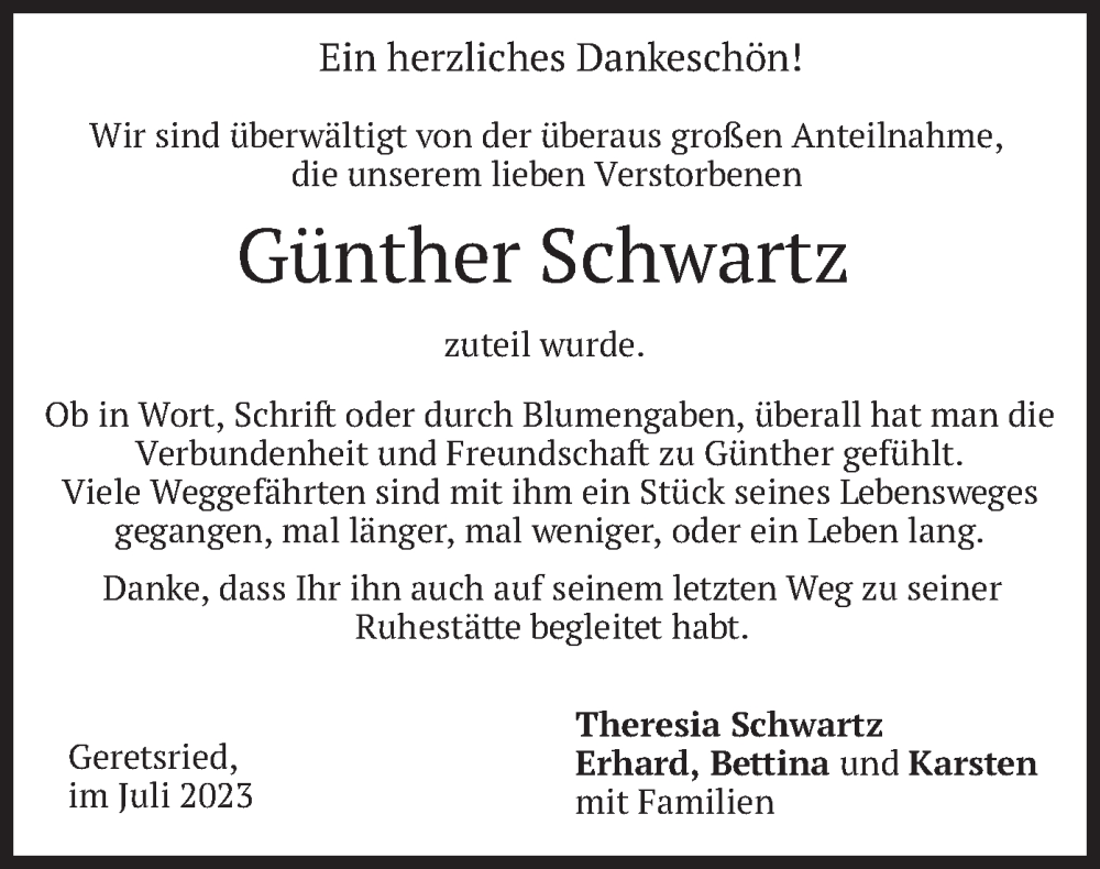 Hier finden Sie alle Traueranzeigen aus der Zeitung, die bisher für Günther Schwartz erschienen sind. Weitere Traueranzeigen, die in der Zeitung erscheinen, werden hier ebenfalls aufgelistet