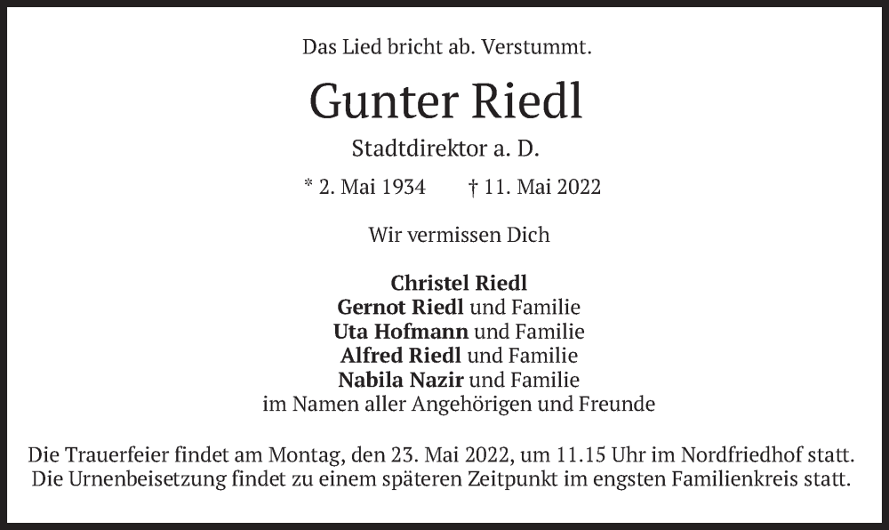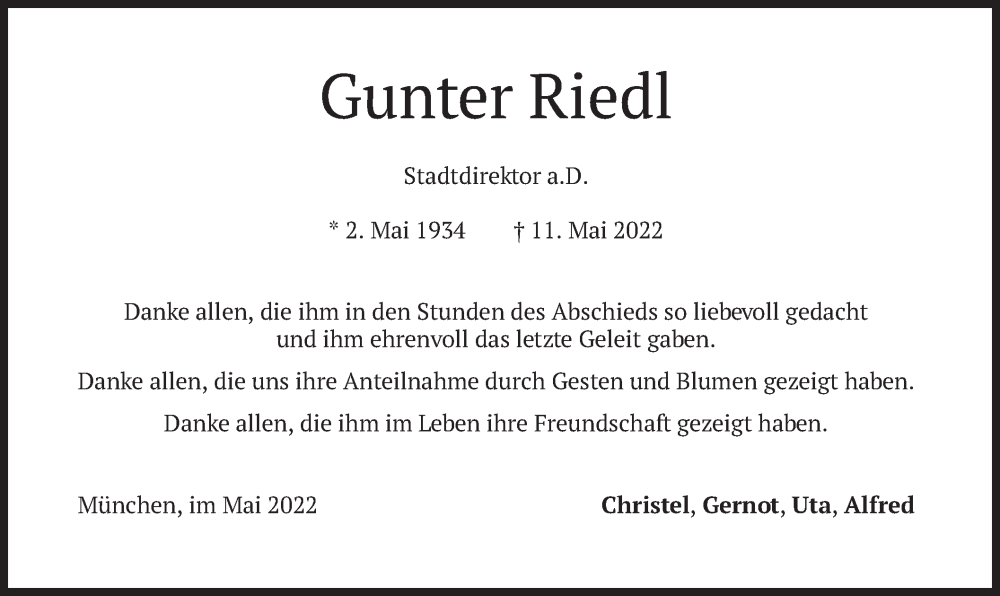 Hier finden Sie alle Traueranzeigen aus der Zeitung, die bisher für Gunter Riedl erschienen sind. Weitere Traueranzeigen, die in der Zeitung erscheinen, werden hier ebenfalls aufgelistet