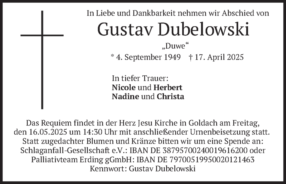 Hier finden Sie alle Traueranzeigen aus der Zeitung, die bisher für Gustav Dubelowski erschienen sind. Weitere Traueranzeigen, die in der Zeitung erscheinen, werden hier ebenfalls aufgelistet