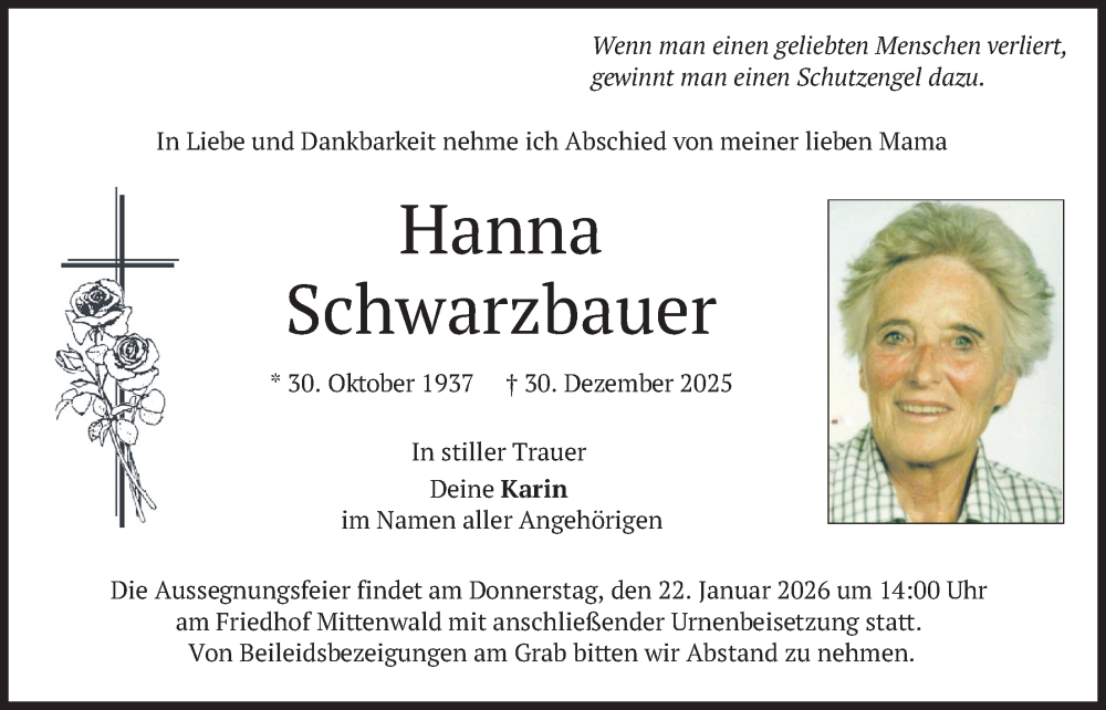 Hier finden Sie alle Traueranzeigen aus der Zeitung, die bisher für Hanna Schwarzbauer erschienen sind. Weitere Traueranzeigen, die in der Zeitung erscheinen, werden hier ebenfalls aufgelistet