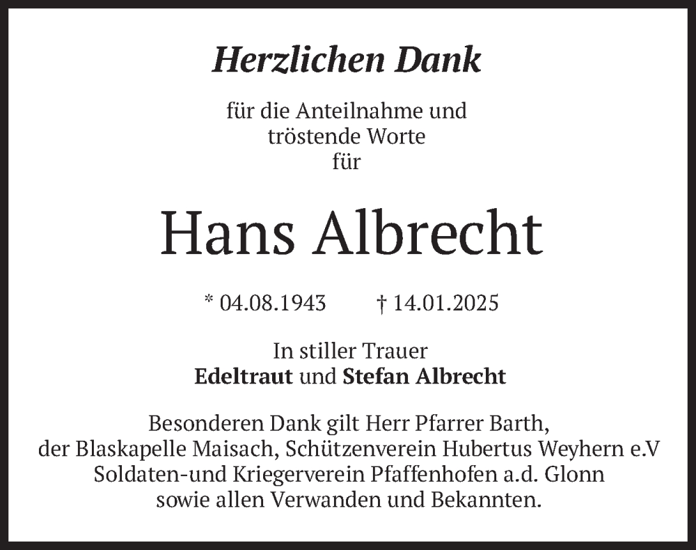 Hier finden Sie alle Traueranzeigen aus der Zeitung, die bisher für Hans Albrecht erschienen sind. Weitere Traueranzeigen, die in der Zeitung erscheinen, werden hier ebenfalls aufgelistet