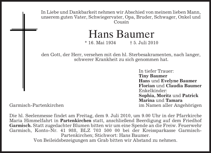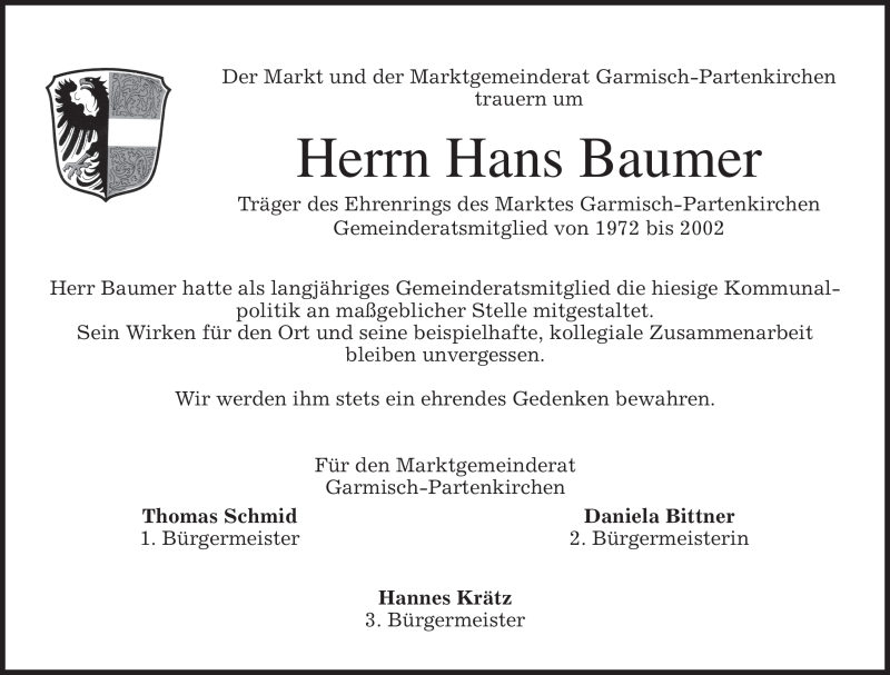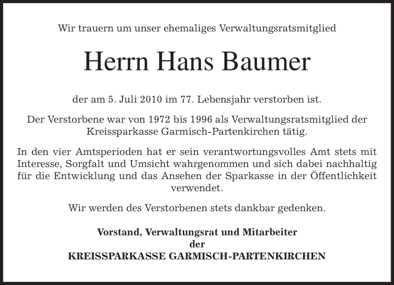 Hier finden Sie alle Traueranzeigen aus der Zeitung, die bisher für Hans Baumer erschienen sind. Weitere Traueranzeigen, die in der Zeitung erscheinen, werden hier ebenfalls aufgelistet