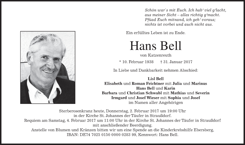 Hier finden Sie alle Traueranzeigen aus der Zeitung, die bisher für Hans Bell erschienen sind. Weitere Traueranzeigen, die in der Zeitung erscheinen, werden hier ebenfalls aufgelistet