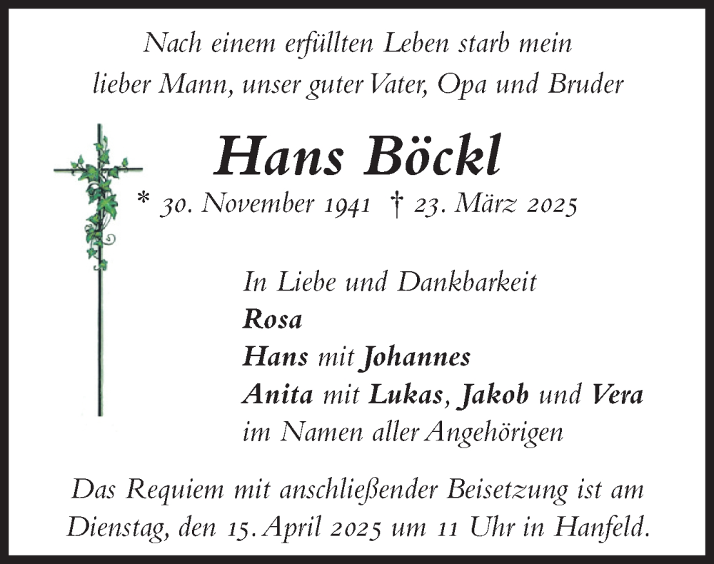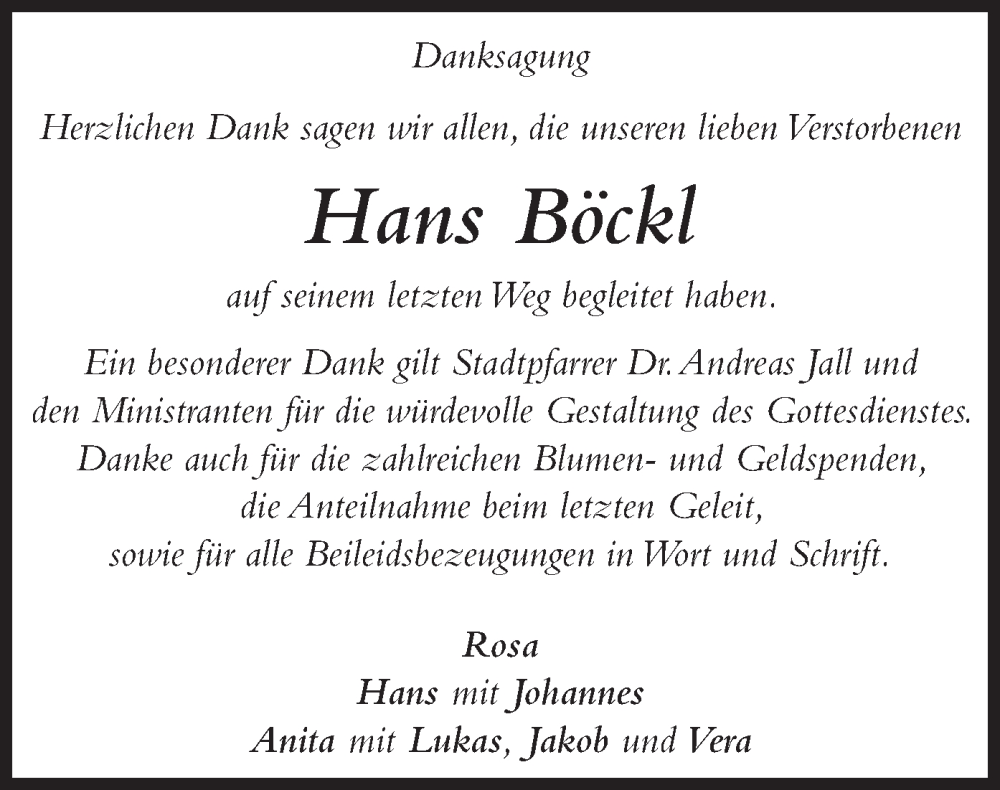 Hier finden Sie alle Traueranzeigen aus der Zeitung, die bisher für Hans Böckl erschienen sind. Weitere Traueranzeigen, die in der Zeitung erscheinen, werden hier ebenfalls aufgelistet