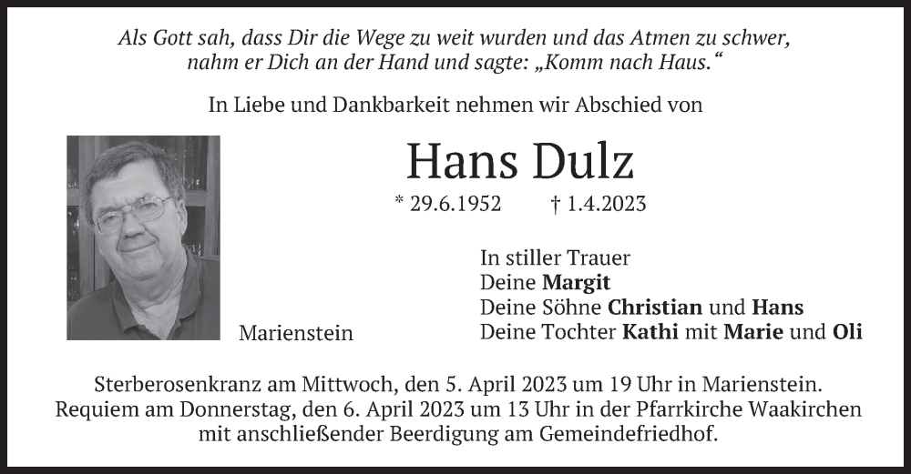 Hier finden Sie alle Traueranzeigen aus der Zeitung, die bisher für Hans Dulz erschienen sind. Weitere Traueranzeigen, die in der Zeitung erscheinen, werden hier ebenfalls aufgelistet