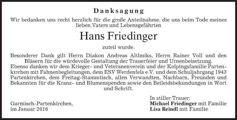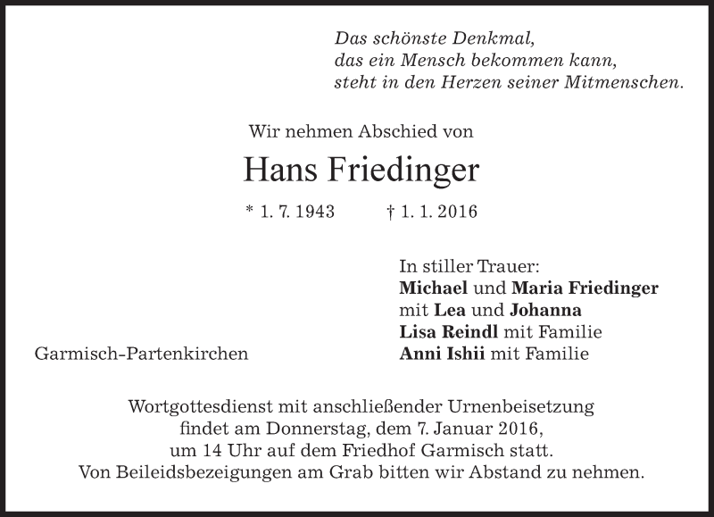Hier finden Sie alle Traueranzeigen aus der Zeitung, die bisher für Hans Friedinger erschienen sind. Weitere Traueranzeigen, die in der Zeitung erscheinen, werden hier ebenfalls aufgelistet