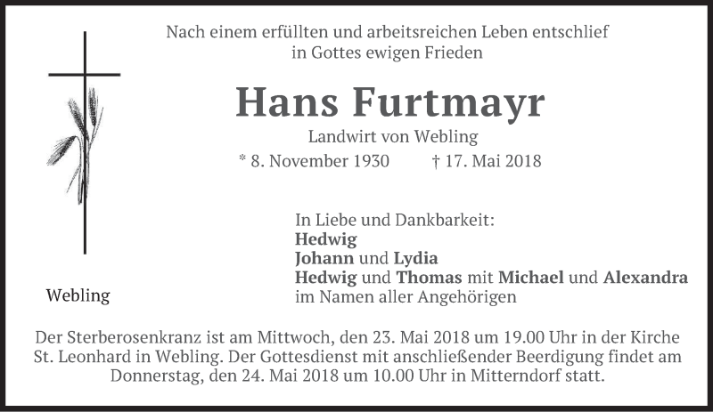 Hier finden Sie alle Traueranzeigen aus der Zeitung, die bisher für Hans Furtmayr erschienen sind. Weitere Traueranzeigen, die in der Zeitung erscheinen, werden hier ebenfalls aufgelistet