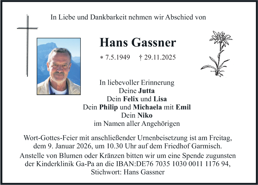Hier finden Sie alle Traueranzeigen aus der Zeitung, die bisher für Hans Gassner erschienen sind. Weitere Traueranzeigen, die in der Zeitung erscheinen, werden hier ebenfalls aufgelistet