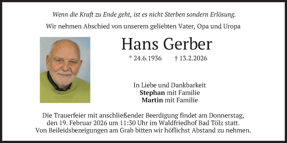 Hier finden Sie alle Traueranzeigen aus der Zeitung, die bisher für Hans Gerber erschienen sind. Weitere Traueranzeigen, die in der Zeitung erscheinen, werden hier ebenfalls aufgelistet