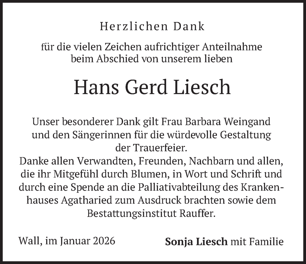 Hier finden Sie alle Traueranzeigen aus der Zeitung, die bisher für Hans Gerd Liesch erschienen sind. Weitere Traueranzeigen, die in der Zeitung erscheinen, werden hier ebenfalls aufgelistet
