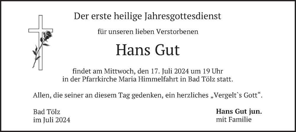 Hier finden Sie alle Traueranzeigen aus der Zeitung, die bisher für Hans Gut erschienen sind. Weitere Traueranzeigen, die in der Zeitung erscheinen, werden hier ebenfalls aufgelistet