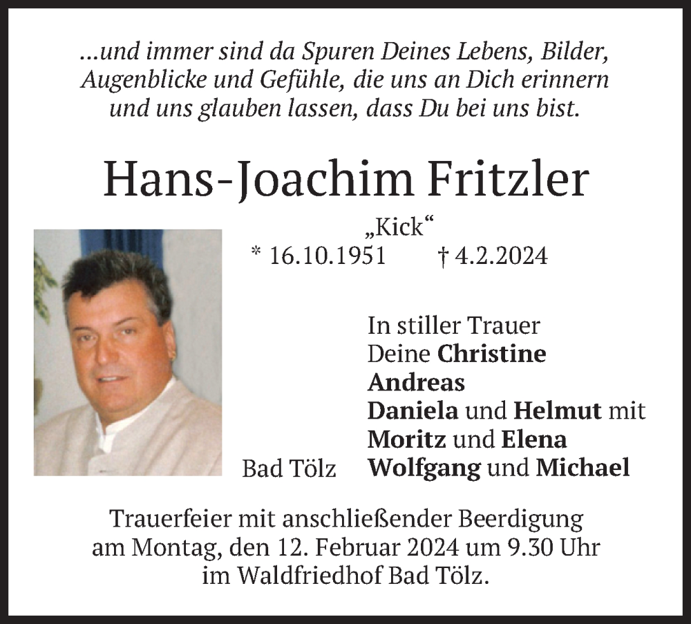Hier finden Sie alle Traueranzeigen aus der Zeitung, die bisher für Hans-Joachim Fritzler erschienen sind. Weitere Traueranzeigen, die in der Zeitung erscheinen, werden hier ebenfalls aufgelistet