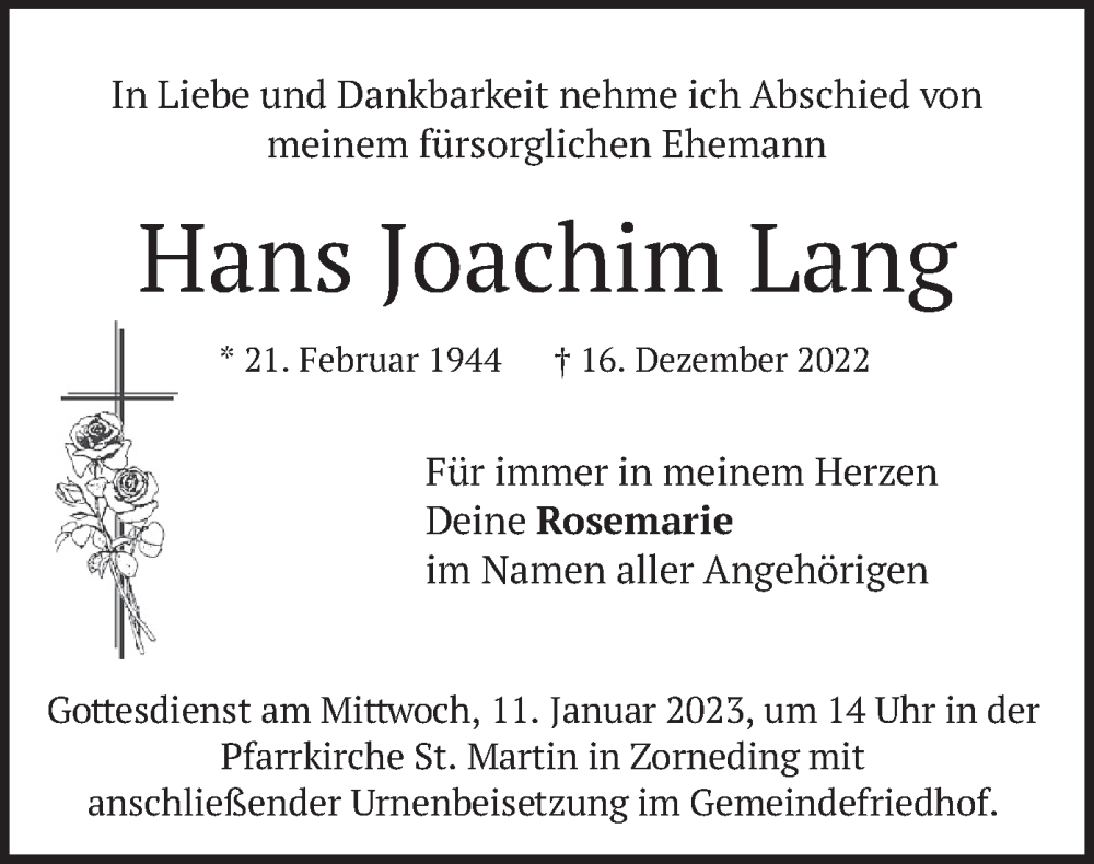 Hier finden Sie alle Traueranzeigen aus der Zeitung, die bisher für Hans Joachim Lang erschienen sind. Weitere Traueranzeigen, die in der Zeitung erscheinen, werden hier ebenfalls aufgelistet