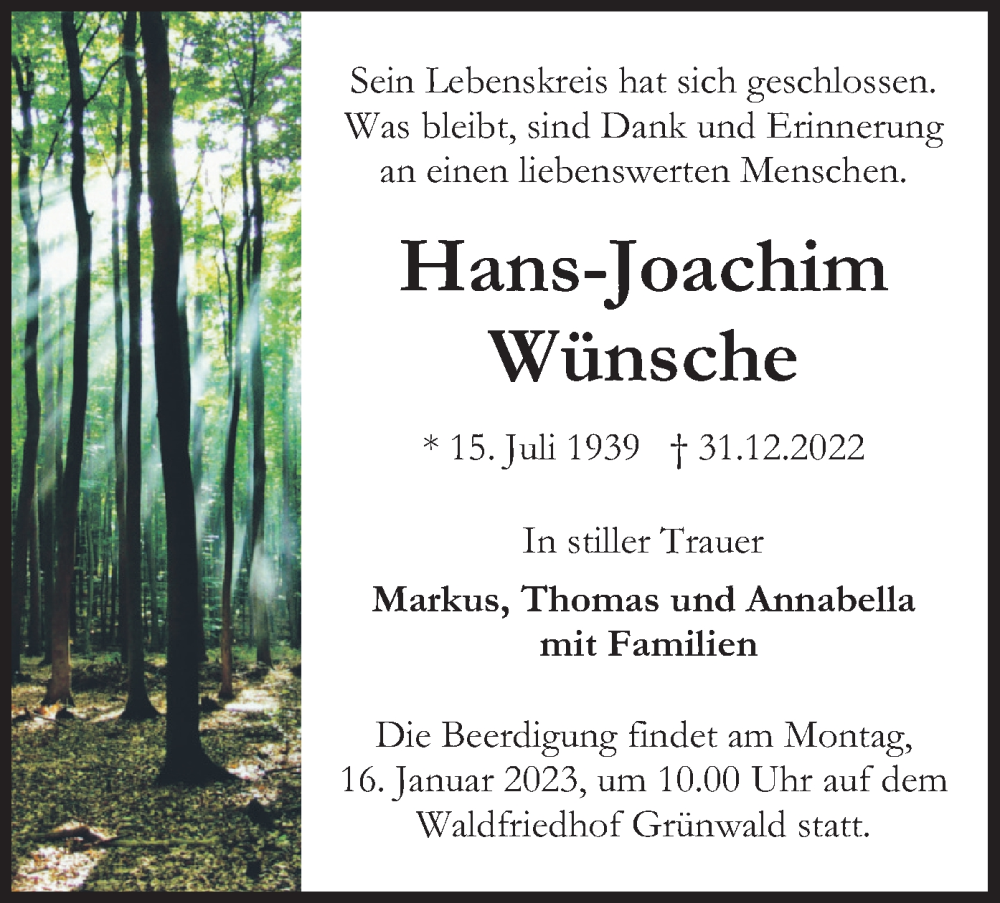 Hier finden Sie alle Traueranzeigen aus der Zeitung, die bisher für Hans-Joachim Wünsche erschienen sind. Weitere Traueranzeigen, die in der Zeitung erscheinen, werden hier ebenfalls aufgelistet