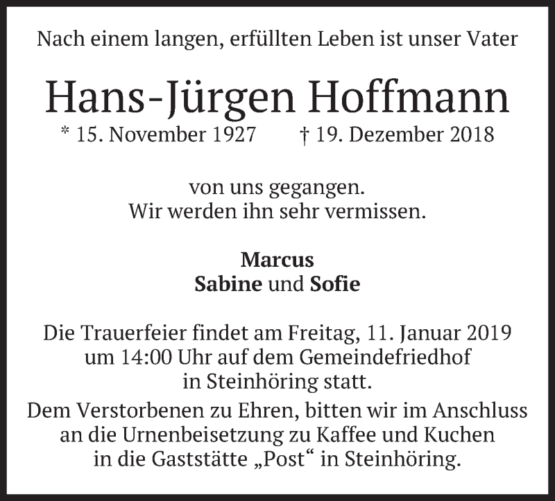 Hier finden Sie alle Traueranzeigen aus der Zeitung, die bisher für Hans-Jürgen Hoffmann erschienen sind. Weitere Traueranzeigen, die in der Zeitung erscheinen, werden hier ebenfalls aufgelistet