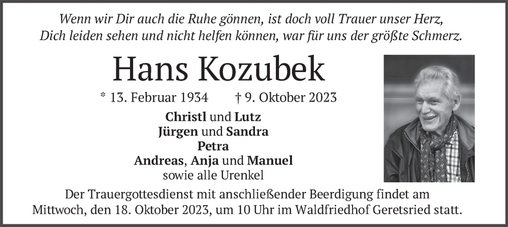 Hier finden Sie alle Traueranzeigen aus der Zeitung, die bisher für Hans Kozubek erschienen sind. Weitere Traueranzeigen, die in der Zeitung erscheinen, werden hier ebenfalls aufgelistet