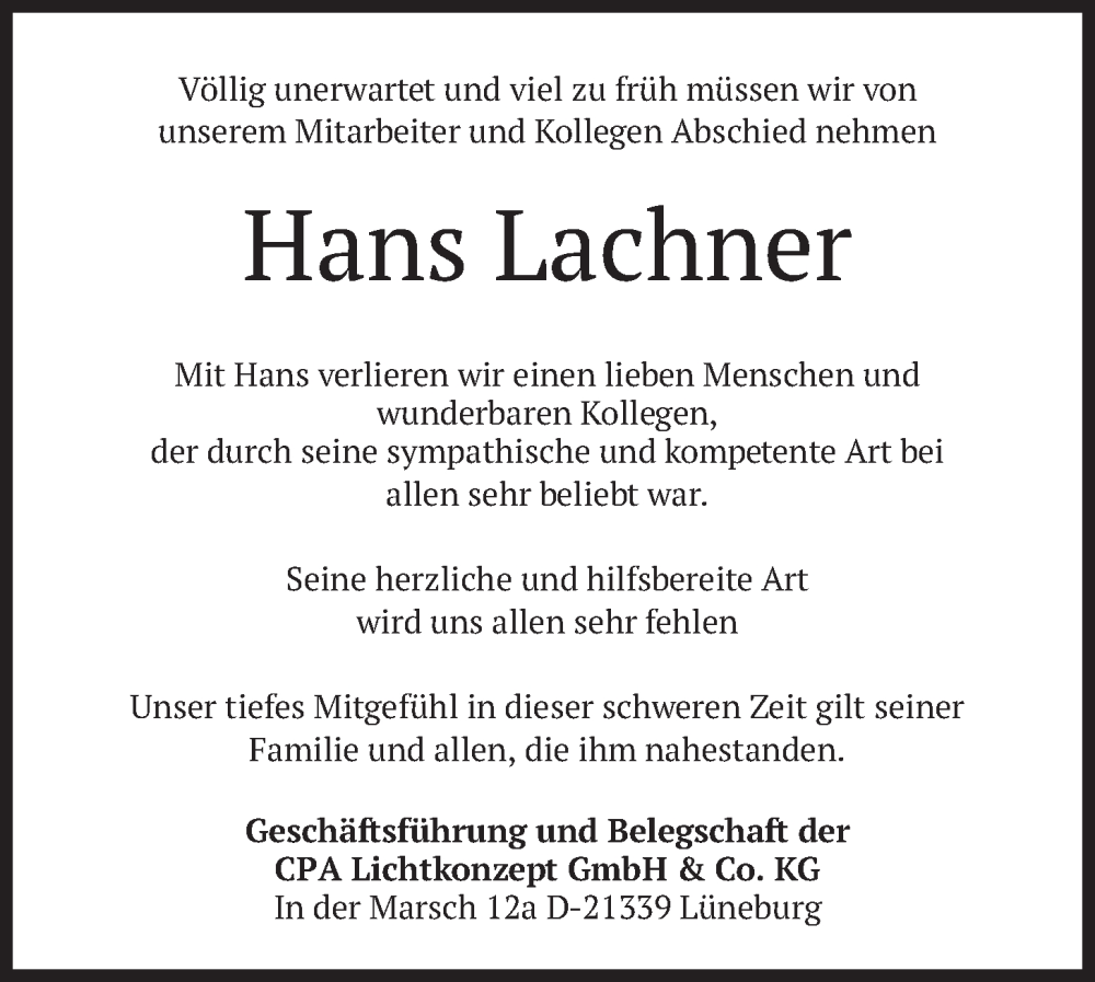 Hier finden Sie alle Traueranzeigen aus der Zeitung, die bisher für Hans Lachner erschienen sind. Weitere Traueranzeigen, die in der Zeitung erscheinen, werden hier ebenfalls aufgelistet