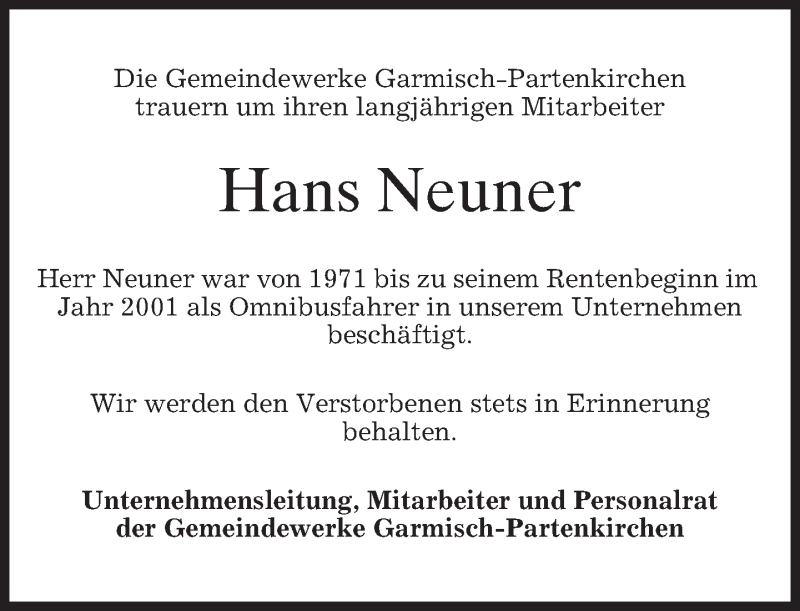 Hier finden Sie alle Traueranzeigen aus der Zeitung, die bisher für Hans Neuner erschienen sind. Weitere Traueranzeigen, die in der Zeitung erscheinen, werden hier ebenfalls aufgelistet