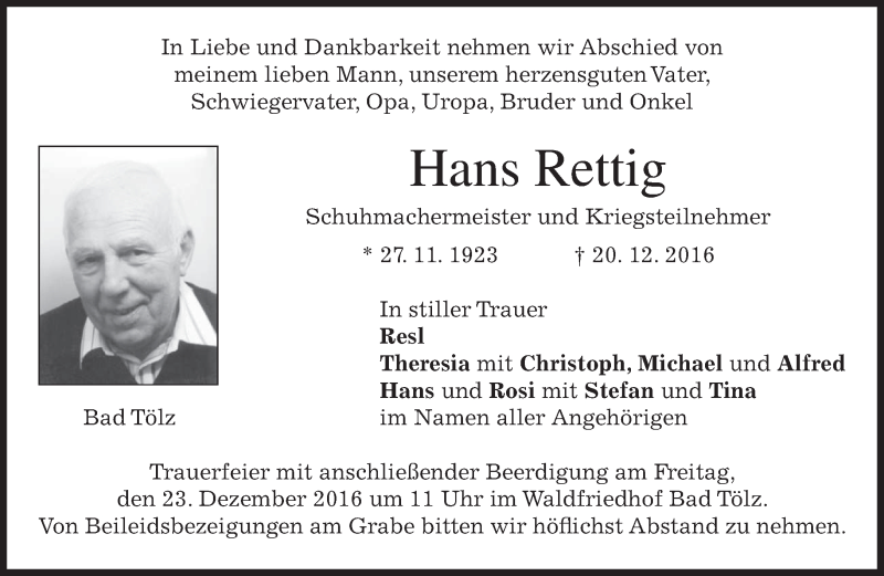 Hier finden Sie alle Traueranzeigen aus der Zeitung, die bisher für Hans Rettig erschienen sind. Weitere Traueranzeigen, die in der Zeitung erscheinen, werden hier ebenfalls aufgelistet
