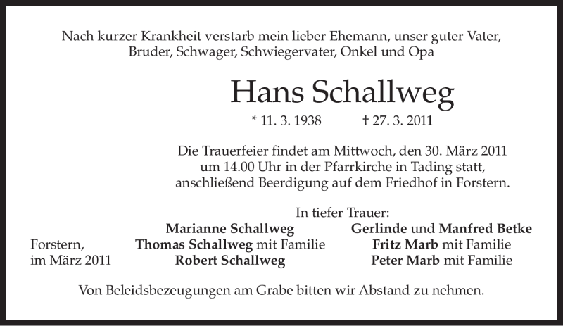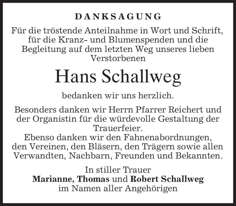 Hier finden Sie alle Traueranzeigen aus der Zeitung, die bisher für Hans Schallweg erschienen sind. Weitere Traueranzeigen, die in der Zeitung erscheinen, werden hier ebenfalls aufgelistet