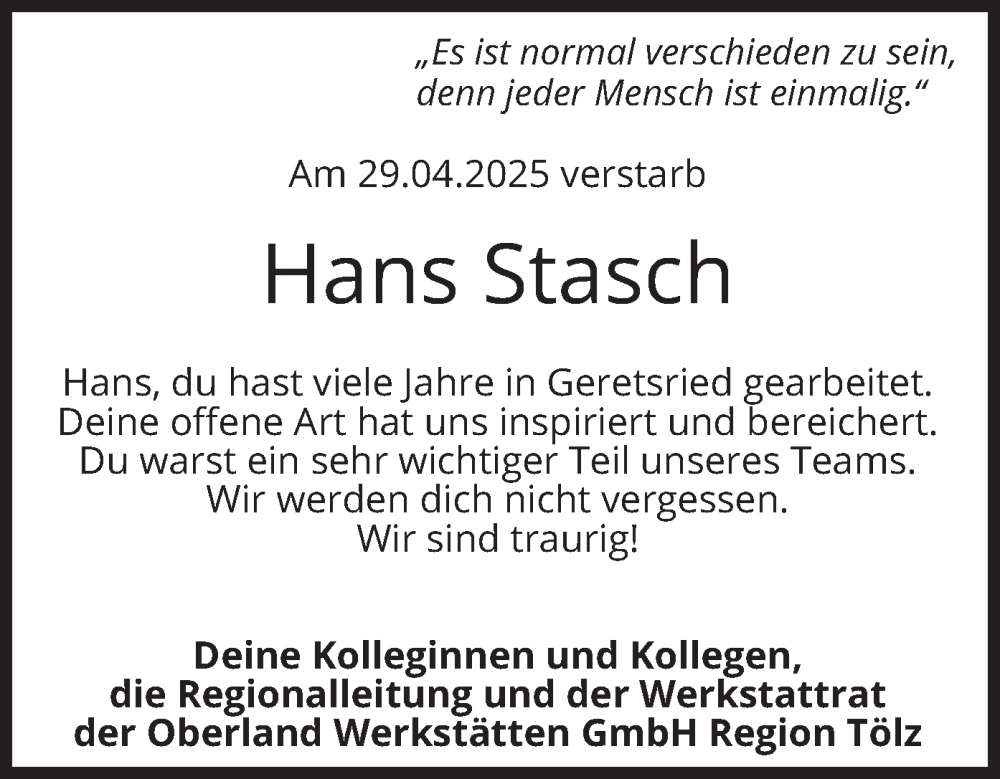 Hier finden Sie alle Traueranzeigen aus der Zeitung, die bisher für Hans Stasch erschienen sind. Weitere Traueranzeigen, die in der Zeitung erscheinen, werden hier ebenfalls aufgelistet