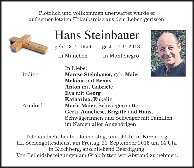 Hier finden Sie alle Traueranzeigen aus der Zeitung, die bisher für Hans Steinbauer erschienen sind. Weitere Traueranzeigen, die in der Zeitung erscheinen, werden hier ebenfalls aufgelistet