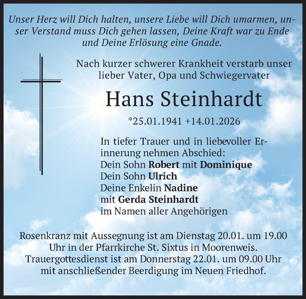 Hier finden Sie alle Traueranzeigen aus der Zeitung, die bisher für Hans Steinhardt erschienen sind. Weitere Traueranzeigen, die in der Zeitung erscheinen, werden hier ebenfalls aufgelistet