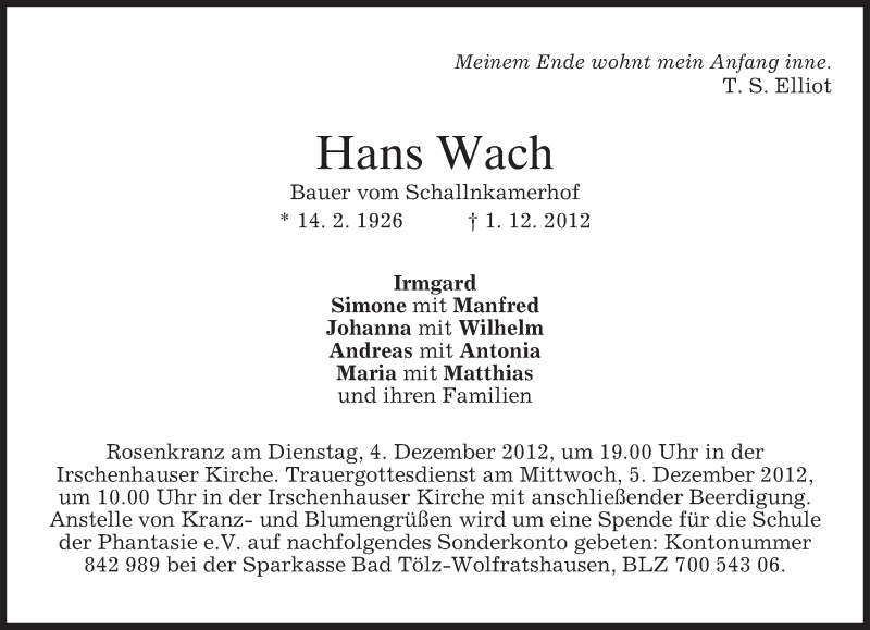 Hier finden Sie alle Traueranzeigen aus der Zeitung, die bisher für Hans Wach erschienen sind. Weitere Traueranzeigen, die in der Zeitung erscheinen, werden hier ebenfalls aufgelistet