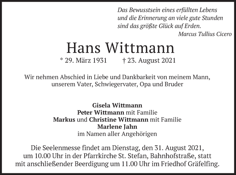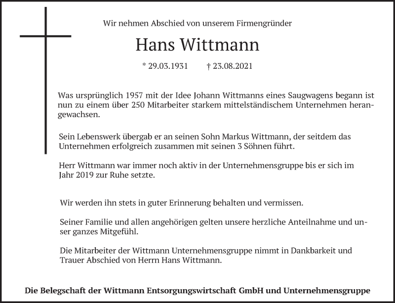 Hier finden Sie alle Traueranzeigen aus der Zeitung, die bisher für Hans Wittmann erschienen sind. Weitere Traueranzeigen, die in der Zeitung erscheinen, werden hier ebenfalls aufgelistet