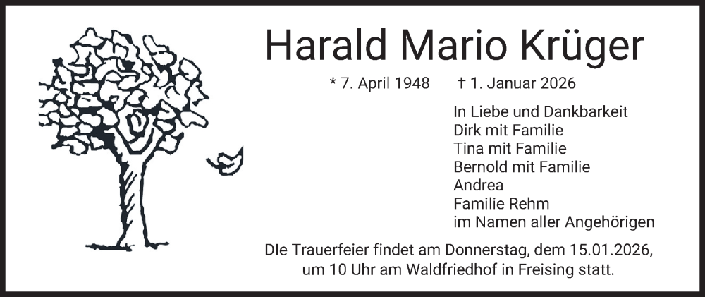 Hier finden Sie alle Traueranzeigen aus der Zeitung, die bisher für Harald Mario Krüger erschienen sind. Weitere Traueranzeigen, die in der Zeitung erscheinen, werden hier ebenfalls aufgelistet