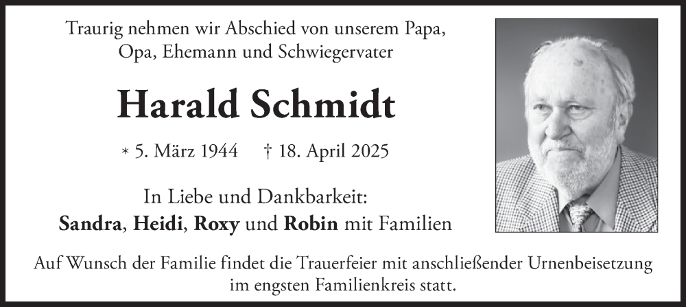 Hier finden Sie alle Traueranzeigen aus der Zeitung, die bisher für Harald Schmidt erschienen sind. Weitere Traueranzeigen, die in der Zeitung erscheinen, werden hier ebenfalls aufgelistet
