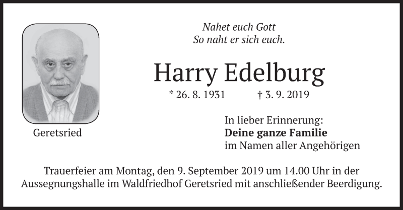 Hier finden Sie alle Traueranzeigen aus der Zeitung, die bisher für Harry Edelburg erschienen sind. Weitere Traueranzeigen, die in der Zeitung erscheinen, werden hier ebenfalls aufgelistet
