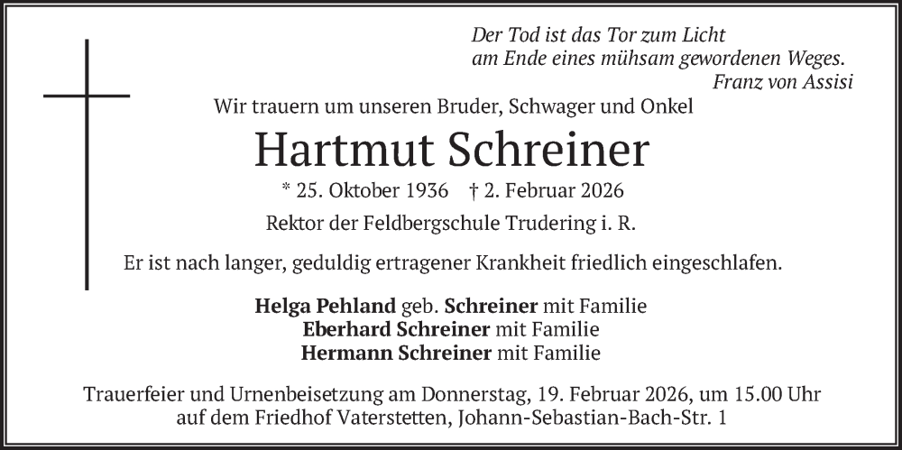 Hier finden Sie alle Traueranzeigen aus der Zeitung, die bisher für Hartmut Schreiner erschienen sind. Weitere Traueranzeigen, die in der Zeitung erscheinen, werden hier ebenfalls aufgelistet