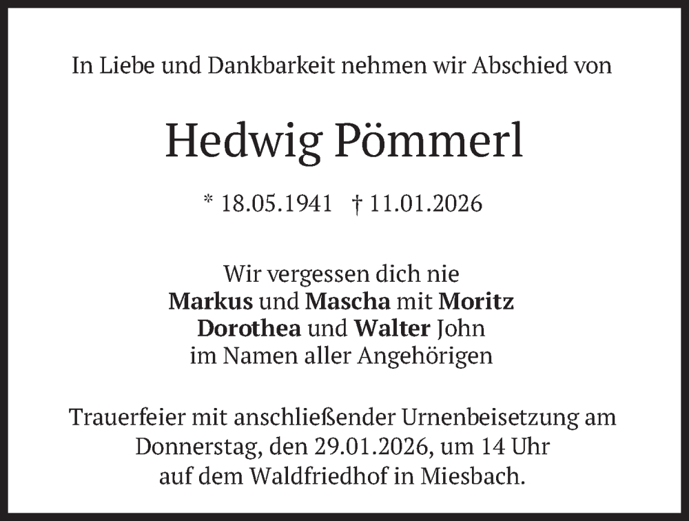 Hier finden Sie alle Traueranzeigen aus der Zeitung, die bisher für Hedwig Pömmerl erschienen sind. Weitere Traueranzeigen, die in der Zeitung erscheinen, werden hier ebenfalls aufgelistet
